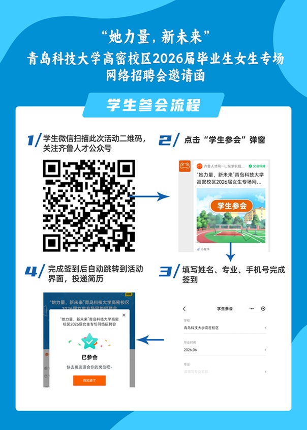 为深入贯彻落实党的二十大四中全会精神及党中央、国务院“稳就业”“保就业”决策部署,全面执行山东省教育厅、山东省人力资源和社会保障厅关于促进高校毕业生更加充分更高质量就业的工作要求,切实维护女毕业生就业权益,为女毕业生提供精准化、专业化就业服务,青岛科技大学高密校区特策划举办“她力量新未来”2026届毕业生女生专场网络招聘会。我们期待通过此次活动,为校区广大女学子开启一扇通往职业梦想的窗口,助力她们在建设新时代社会主义现代化强省的宏伟征程中,贡献独特的“她力量”,书写绚丽的“新未来”。